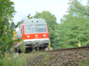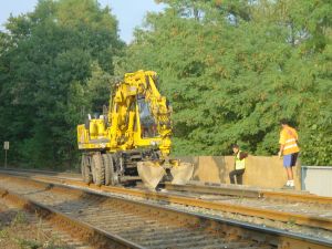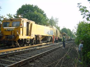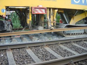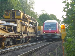Und nochmal schlich so ein Bauzugungetüm über die Strecke. Diesmal mit dem Auftrag, Schwellen und Schienen auszuwechseln. Auch diesmal gab es viele Zaungäste, aber Vorsicht, auf dem anderen Gleis gab es noch immer regen Zugverkehr!