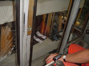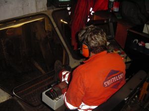 In der Kabine vorne, so der Tipp, gibt es auch noch einiges zu sehen, und zwar das Entnehmen der Schwellen, überwacht vom Kollegen, der gleichzeizig der "Lokomotivführer " ist: