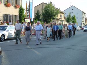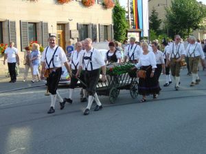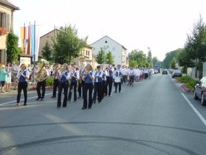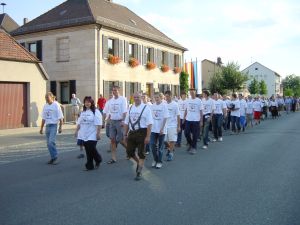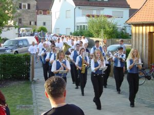 Schon bald formierte sich der erste Festzug der Rückersdorfer Kerwa, allen voran die Musik, gefolgt von den Kerwamaderln und -Buam, anschließend die Böllerschützen und, das ist sicher auch eine Rückersdorfer Besonderheit, erst ganz am Ende die Prominenz: