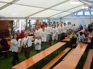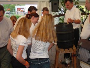 Und dann gab es eine wesentliche, bahnbrechende Neuerung der Rückersdorfer Kerwa! Das Fass bekamen nicht die Kerwabuam, sondern die Maderln! Und die begannen sofort mit dem zapfen! Liebe Buam, seids lieb, dan gibts dann vielleicht auch was für euch.