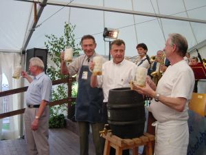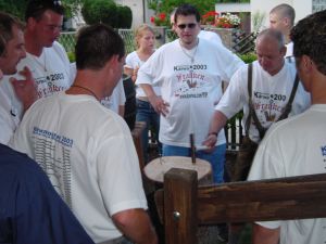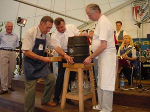 Endlich konnte unser Bürgermeister zur Tat schreiten und das erst Fäßchen erfolgreich mit den obligatorischen drei Schlägen anzapfen. Prost!(Unterstützt von Unserem Festwirt James/Rudi Weinhölzner.) Nun ja, beim Anzapfen ist, zumindest an der Kerwa, jeder Bürgermeiste ein Schaumschläger. (Zumindest verhält sich das Bier so, aber hat da vielleicht einer heimlich das Fass geschüttelt?)