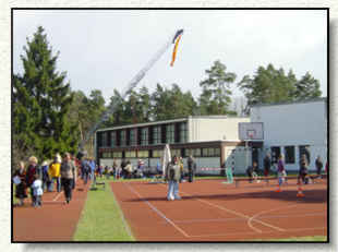die hinter den lebhaften Ballspielern am Schulsportplatz weithin sichbar eine Leiter aufgebaut hatte. doch warum? |
