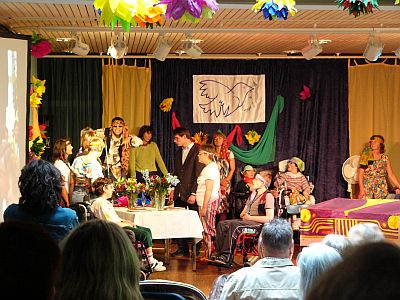 ..aber nicht lange, denn schon bald startete der Höhepunkt des Tages, das Musical Hair, dargeboten von den Schülern, unterstützt von den Erzierinnen (Eine habe ich auf dem Bild entdeckt!), das Publikum war mit Begeisterung dabei.