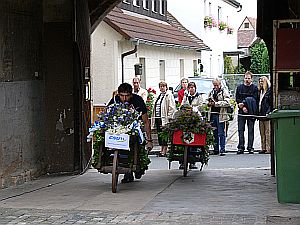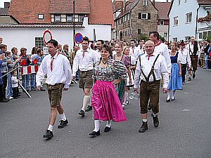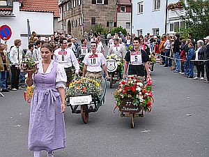 Die Sprecher waren postiert und schon kam er an, der Festzug mit den Haberloher Musikanten, der Prominenz (die lasse ich heuer mal aus), den wunderbar geschmückten Schubkarren, und den Kerwabuam und Madla: