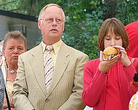 Und natürlich wurden bei einer solchen Gelegenheit jede Mengen Reden geredet! Zum Beispiel von Fee Hoppe, die, passend zum Namen der Kirche, eine Martinsgans verschenkte. Keine Angst, die Nelly, präsentiert von Gerlinde, wird es nicht sein, die dann... (Die wird wahrscheinlich, wie ich Gerlinde kenne, an Altersschwäche...)