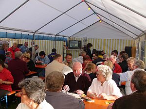 Natürlich ist weiter oben die Zeit nicht stehengeblieben, und so findet das Fest im Zelt statt - nicht so romantisch - aber zweckmäßig. Auch der Fernseher durfte heute nicht fehlen, fand doch das Länderspiel gegen Lettlandt statt...
