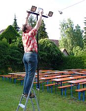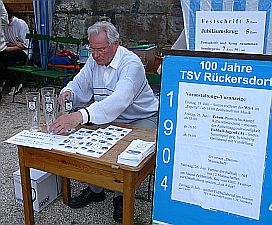 Die letzten Vorbereitungen: Erwin Pirner richtet noch die Scheinwerfer aus, Dieter Fuchs präsentierte die TSV-Jubiläumskrüge und das Team in der Küche sorgte für die belegten Brote...
