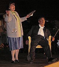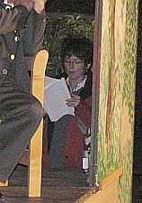 ...derweilen schaute unsere Daggi Pirner nachdenklich auf die Bühne, sollte sie doch die Ochsenwirtin spielen. Aber leider hatte sie an diesem Abend eine Stimmbandentzündung und konnte nur noch flüstern. Dafür sprang Evi Pazin, die Regisseurin ein, die natürlich nicht innerhalb eines Tages den ganzen Text lernen konnte und - das ist auch ein Novum - mit dem Textbuch auf der Bühne stand. Macht nichts, mit ihrem gekonnten Spiel hat sie das Publikum auch mit dem Textbuch in der Hand begeistert!