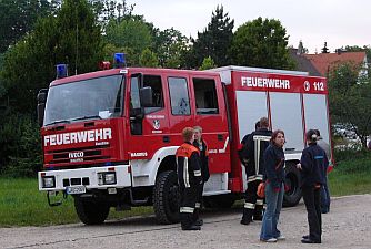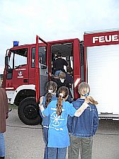 Die Jugendfeuerwehr ist bereit und nutzt die Wartezeit, um den Kindern das Auto zu zeigen.