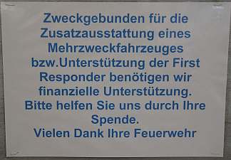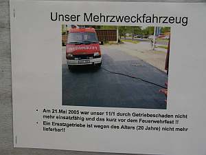 Gleich am Eingang wies eine Schautafel auf das traurige Ende des Mehrzweckfahrzeuges (Getriebeschaden) hin. Spenden für ein neues werden gerne entgegengenommen. Na, im Laufe dieses Abends wechselten etliche "Briefumschläge" Ihren Besitzer...