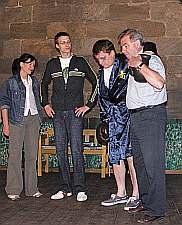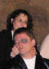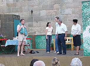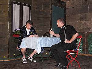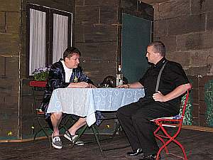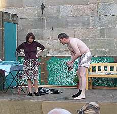 Aber erst einmal hieß es: Runter mit den nassen Klamotten. Von spöttischen Bemerkungen Seiner Frau Karin (Nicole Berger) begleitet. (Eine wahrhaft tolle Leistung wegen der eher kalten Temperatur an diesem Abend! Während so mancher Zuschauer in seiner Jacke frohr, spielte Thomas den ersten Akt fast komplett in der Unterhose!)
