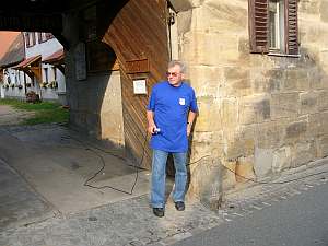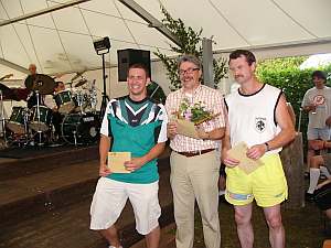 Do sins, die die Orwad mochn, der Dieder middm Hedsed am Schdard, der Fredi middm Migro im Schlusshuuf, und die Daggi mid der Zeddlwerdschafd. (Das sind sie, die die Arbeit machen: Der Dieter Fuchs mit dem Headset am Start, der Fredi Vogt mit dem Mikrofon im Schloß als Moderatoren, und die Daggi Pirner, die die Wertungslisten schrieb.)