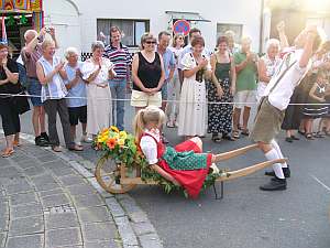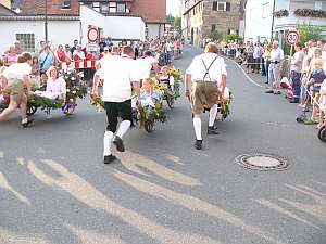 Und zledsd gobs wie immer des schönsde Renna, des mid den Kerwamaderln. Und die sin viel schöner anzuschaun als die Hölzla (Ausserdem fallns net ro vom Schubkarrn!) (Und zuletzt gab es wie immer das Rennen der Kerwabuam und -Maderln. Es ist das schönste Rennen, sind doch die Kerwamaderln ein wirklich schönerer Anblick als die Hölzchen! Da die Maderln sich festhalten und so in der Regel nicht vom Schubkarrn fallen, ist es auch das schnellste Rennen.)